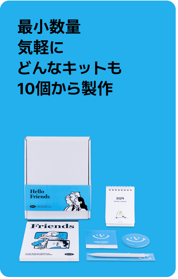 Product Kits最も多く利用されている製品で構成されています様々な製品と形態で今すぐキット製作が可能ですイベント KIT12,000ウォン /1個企業または団体行事に必要な製品で構成されています。 10個から製作可能です。10個から体験団ポップアップオフィス KIT Ⓢ24,000ウォン /1個最近の企業で新規入社者を歓迎する方法! オフィスで誰もが使用するベーシックな製品で構成されています10個からウェルカムキットベーシックオフィス KIT Ⓜ36,000ウォン /1個ウェルカムキットの定番! オフィスで使いやすい製品でウェルカムキットを構成しました10個からウェルカムキットスタンダードフレンズ KIT25,000ウォン /1個体験団または企業が行うイベントに合わせたキットです 私たちの企業をよく説明して理解できる構成品です。10個から体験団ポップアップ